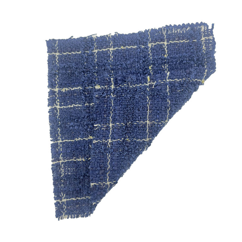 Эта ткань, обозначенная как артикул 19909-10, представляет собой твид из 100% полиэстера, предназначенный для женской одежды. При массе на единицу площади 558 г/м он представляет собой структуру среднего веса. Темно-синяя основа соткана в виде клетчатого узора, в который в процессе производства добавлена металлизированная пряжа. Такое сочетание создает контраст как визуальных, так и тактильных свойств. Полностью полиэфирный состав обеспечивает стабильность размеров и стабильную производительность. Включение металлических элементов придает поверхности ткани светоотражающие детали. Эти особенности делают ткань подходящей для изготовления одежды, в которой приоритетными являются структурная целостность и декоративный эффект.