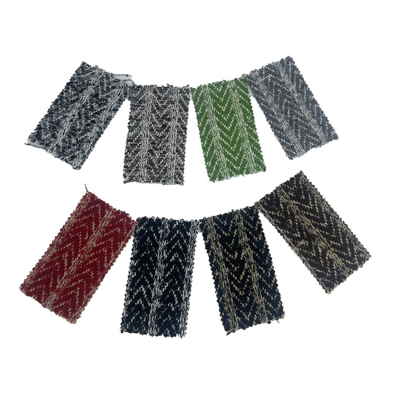 Эта ткань, обозначенная как артикул 3467, представляет собой жаккардовый твид, состоящий из 10% шерсти и 90% других волокон. При массе единицы площади 550 г/м он представляет собой тяжелую конструкцию. Поверхность сочетает в себе узор «елочка» с полосатыми элементами в процессе жаккардового плетения. Для создания рельефной текстуры, напоминающей плюшевую, была нанесена брашированная отделка, образующая плотный ворс на поверхности, который изменяет как визуальные, так и тактильные свойства. Эта техника сохраняет геометрическую точность тканых узоров, добавляя при этом трехмерность. Состав смеси шерсти повышает эластичность и тепловые характеристики ткани. Эти технические характеристики делают эту ткань применимой для проектов, требующих как четкости рисунка, так и характерной текстуры поверхности.