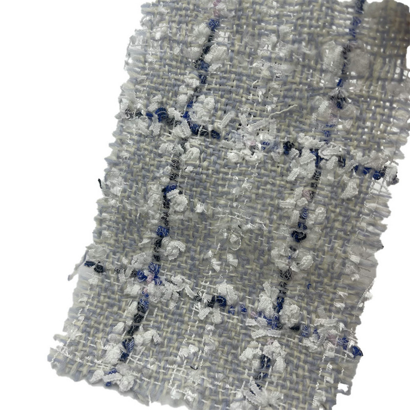 Эта ткань, обозначенная как артикул 23510, представляет собой твидовый текстиль, состоящий из 45% шерсти и 55% полиэстера. При массе единицы площади 425 г/м2 он представляет собой конструкцию среднего веса, подходящую для пальто. Ткань имеет узор в клетку синего, серого и белого цвета, к которому в процессе плетения добавляется мотив бабочки. Такое сочетание создает многослойный визуальный эффект внутри текстильной структуры. Смесь шерсти и полиэстера обеспечивает стабильность размеров и тепловые свойства ткани. Эти технические характеристики делают твид применимым для изготовления верхней одежды, где требуется сложность рисунка и структурная целостность.