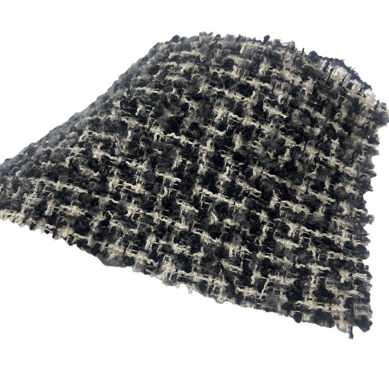 Эта ткань, обозначенная как артикул 23515, представляет собой твидовый текстиль, состоящий из 77% полиэстера, 14% хлопка, 4% шерсти, 4% акрила и 1% нейлона. При массе единицы площади 420 г/м2 он представляет собой конструкцию среднего веса. Поверхность имеет тисненый узор в сочетании с петельной структурой пряжи, создающей фактурный тактильный эффект. Смесь нескольких волокон сочетает в себе стабильность полиэстера, влагопоглощение хлопка, натуральный характер шерсти, лофт акрила и усиление нейлона. В результате такой комбинации получается ткань с размерностью поверхности и структурной целостностью. Эти характеристики делают его применимым для одежды, требующей как визуальной текстуры, так и функциональной долговечности.