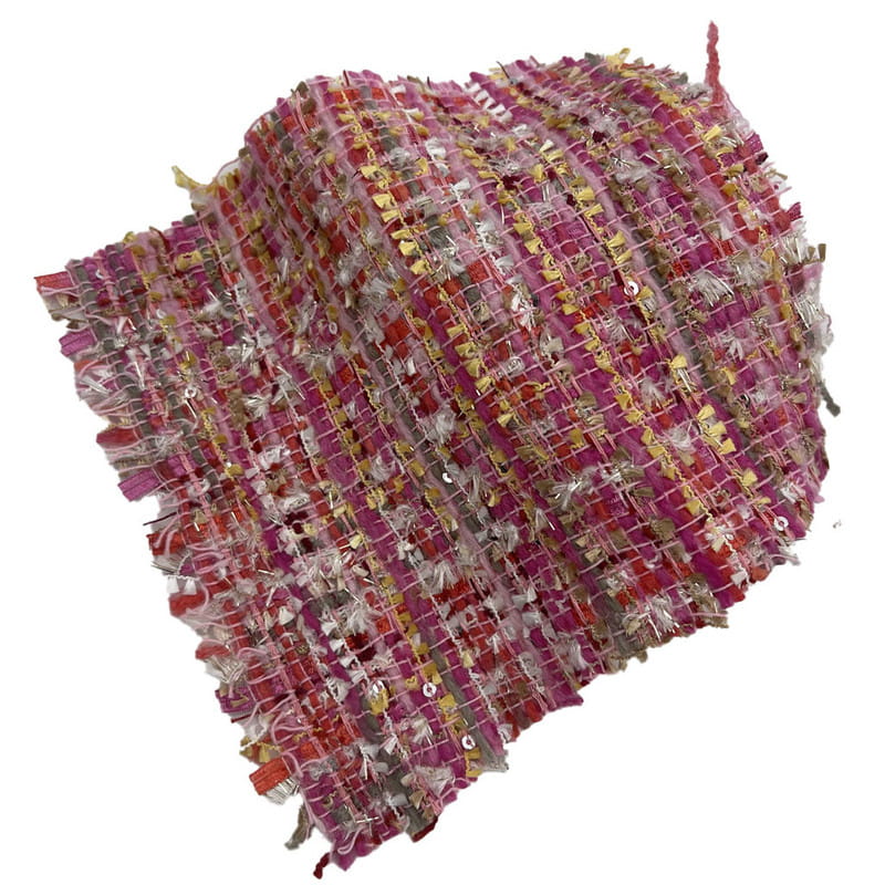 Эта ткань, обозначенная как артикул 21003, представляет собой твидовый текстиль, состоящий из 67% полиэстера и 33% акрила. При массе единицы площади 385 г/м2 он представляет собой конструкцию среднего веса. Ткань включает в себя красные и розовые блестки в сочетании с металлизированной пряжей, которая в процессе плетения создает рассеянную отражающую поверхность. Полиэфирная основа обеспечивает структурную стабильность, а акриловый компонент придает ткани пышность и текстуру. В результате этой комбинации получается материал с различным светоотражением и размерностью поверхности. Эти технические характеристики делают твид применимым для женской одежды, где требуются декоративные элементы и структурная целостность.