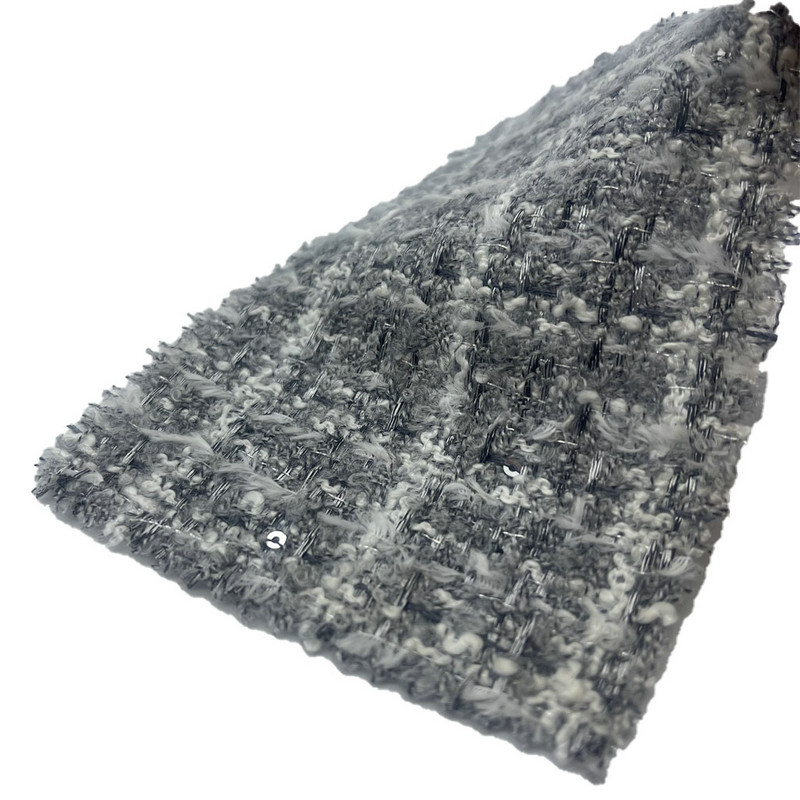 Эта ткань, обозначенная как артикул 23503, представляет собой твидовый текстиль, состоящий из 49% акрила, 40% полиэстера, 7% шерсти и 4% нейлона. При массе единицы площади 335 г/м2 он представляет собой легкую, но структурированную конструкцию. Поверхность имеет мелкий серый клетчатый узор, полученный с помощью процесса тиснения, который создает тонкую рельефную текстуру на ткани. Эта техника визуально увеличивает глубину пледа, не меняя при этом тканую основу. Смесь нескольких волокон сочетает в себе стабильность полиэстера, эластичность акрила, естественность шерсти и долговечность нейлона. Эти характеристики делают ткань подходящей для женской одежды, где требуется детальный рисунок и тактильный интерес.