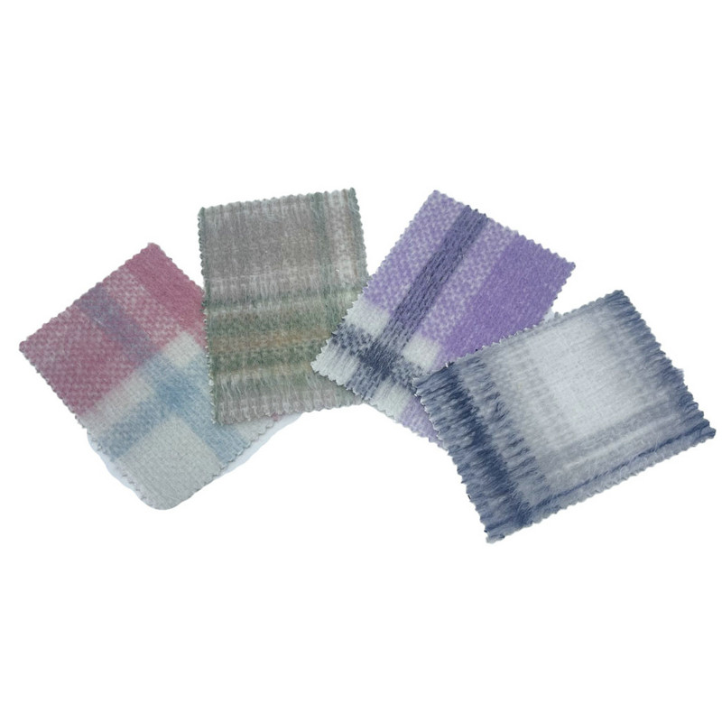 Эта ткань, обозначенная как артикул 3940, представляет собой жаккардовый текстиль, состоящий из 10% шерсти и 90% других волокон. При массе единицы площади 600 г/м он представляет собой тяжелую конструкцию. Фиолетовая поверхность сочетает в себе клетчатый узор и текстуру длинного ворса, полученную с помощью специальных техник жаккардового плетения и отделки. Этот производственный процесс создает на поверхности ткани удлиненные петли волокон, в результате чего образуется выраженная трехмерная структура. Состав смесовой шерсти улучшает теплоизоляционные свойства и эластичность ткани. Эти технические характеристики позволяют получить материал со значительной глубиной и объемом поверхности, что делает его применимым для пальто, где требуется повышенная теплота и текстура.