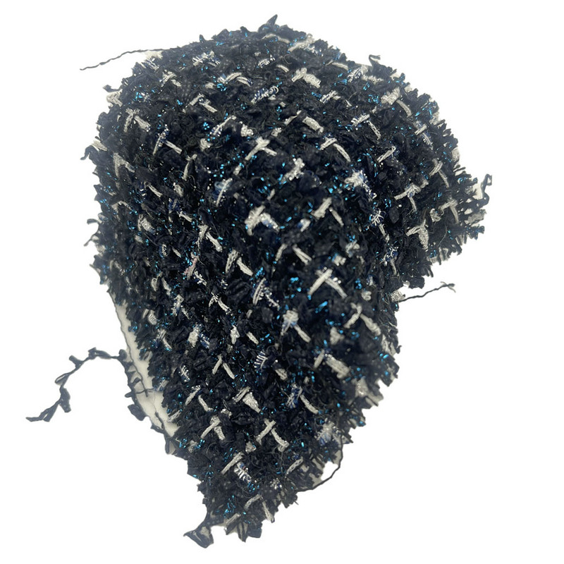 Эта ткань, обозначенная как артикул 23511, представляет собой клетчатый твид, состоящий из 86% полиэстера и 14% нейлона. При массе единицы площади 340 г/м2 он представляет собой легкую конструкцию. Темно-синяя основа включает в себя синюю металлизированную нить внутри клетчатого узора, создавая контрастный визуальный эффект за счет различного отражения света. Смесь полиэстера и нейлона обеспечивает стабильность размеров и структурную однородность. Включение металлических элементов придает тканой поверхности светоинтерактивные свойства. Эти технические характеристики делают эту твидовую ткань применимой для женской одежды, где требуется четкое различение узора и тонкие вариации поверхности.