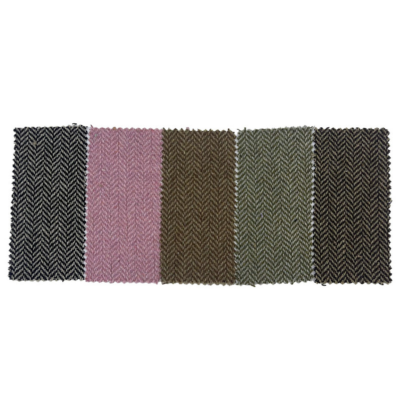 Эта ткань, обозначенная как артикул 3532, представляет собой жаккардовый текстиль, состоящий из 20% шерсти и 80% других волокон. При массе единицы площади 500 г/м он представляет собой конструкцию среднего и тяжелого веса. Розовая поверхность украшена узором «елочка», созданным в процессе жаккардового плетения, который образует точные V-образные узоры на ткани. Этот метод создает последовательную направленную текстуру с определенным геометрическим повторением. Состав смесовой шерсти способствует сохранению тепловых свойств ткани и сохранению формы. Благодаря этим техническим характеристикам получается материал со структурной плотностью и четкостью рисунка, что делает его применимым для брюк, где требуется как визуальное четкость, так и стабильность размеров.