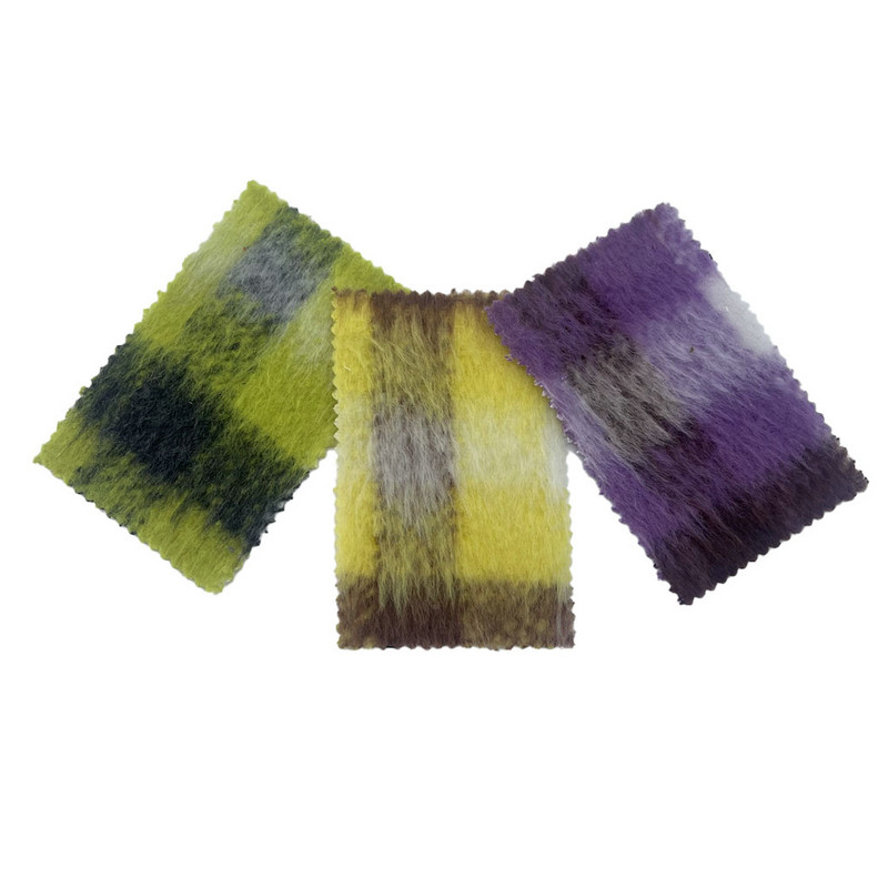 Эта ткань, обозначенная как артикул 3256, представляет собой твидовый текстиль, состоящий из 20% шерсти и 80% других волокон. При массе единицы площади 700 г/м он представляет собой тяжелую конструкцию. Фиолетовая поверхность имеет клетчатый узор, объединенный с текстурой длинного ворса, создавая сложную структуру посредством специализированных процессов плетения и отделки. Эта технология производства позволяет увеличить длину волокон на поверхности, что приводит к выраженному трехмерному эффекту. Состав смеси шерсти способствует теплоизоляционным свойствам ткани и структурной устойчивости. Благодаря этим техническим характеристикам получается материал со значительным объемом и глубиной поверхности, что делает его применимым для пальто, где требуется повышенное тепло и текстура.