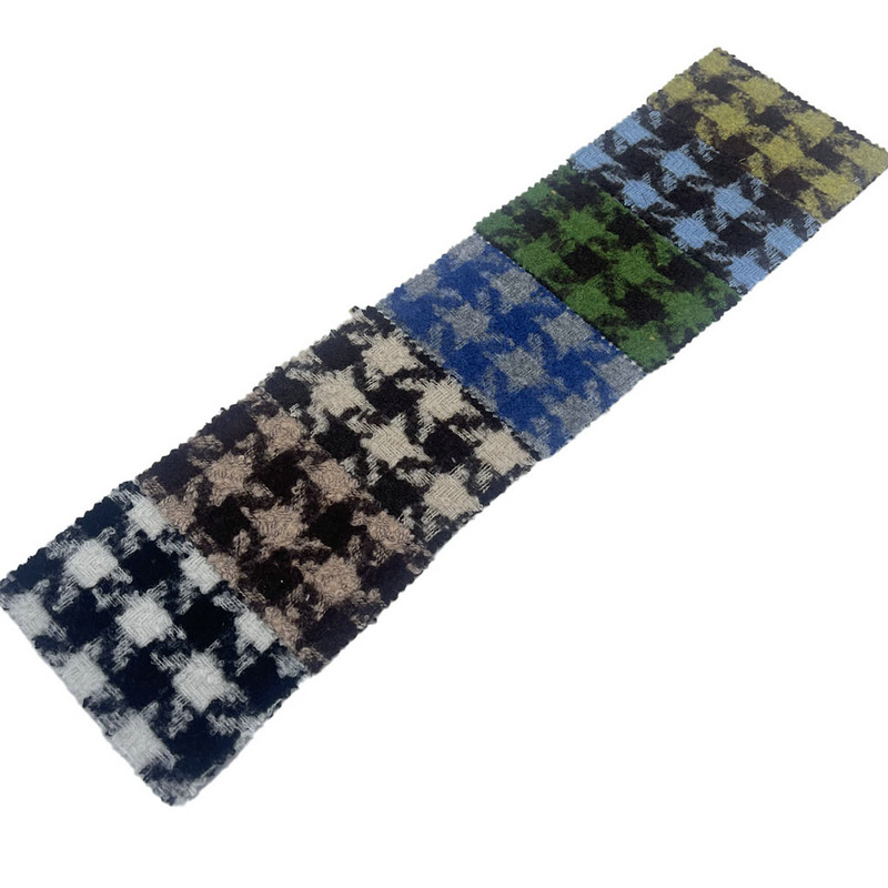 Эта ткань, обозначенная как артикул 2882, представляет собой жаккардовый твид, состоящий из 10% шерсти и 90% других волокон. При массе единицы площади 600 г/м он представляет собой тяжелую конструкцию. Поверхность сочетает в себе узор «гусиные лапки» с клетчатыми элементами в процессе жаккардового плетения. Для создания рельефной текстуры, напоминающей плюшевую, была нанесена брашированная отделка, образующая плотную поверхность с коротким ворсом. Эта техника изменяет как визуальную глубину, так и тактильные свойства ткани, сохраняя при этом геометрическую точность тканых узоров. Состав смеси шерсти способствует устойчивости материала и теплоизоляции. Эти технические характеристики делают эту ткань применимой для проектов, требующих как сложного рисунка, так и характерной текстуры поверхности.