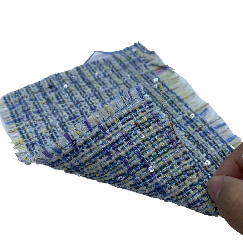 Эта ткань, обозначенная как артикул ZZH24018, представляет собой твидовый текстиль, состоящий из 20% шерсти и 80% полиэстера. При массе единицы площади 560 г/м материал представляет собой конструкцию среднего веса. Ткань украшена металлическими блестками, закрепленными внутри твидовой структуры, создавая прерывистое отражение света на поверхности. Смесь шерсти и полиэстера обеспечивает баланс между характеристиками натуральных волокон и структурной однородностью. В результате этой комбинации получается материал с вариацией текстуры поверхности и стабильностью размеров. Эти характеристики делают эту твидовую ткань применимой для пошива женских фраков, где важны как внешний вид, так и практичность.